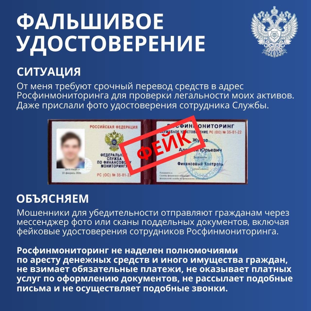 Для убедительности мошенники направляют гражданам поддельные документы: удостоверения якобы сотрудников Росфинмониторинга, письма от ведомства с подложными оттисками печати, символикой Службы, фиктивными подписями и указанием ФИО должностных лиц.