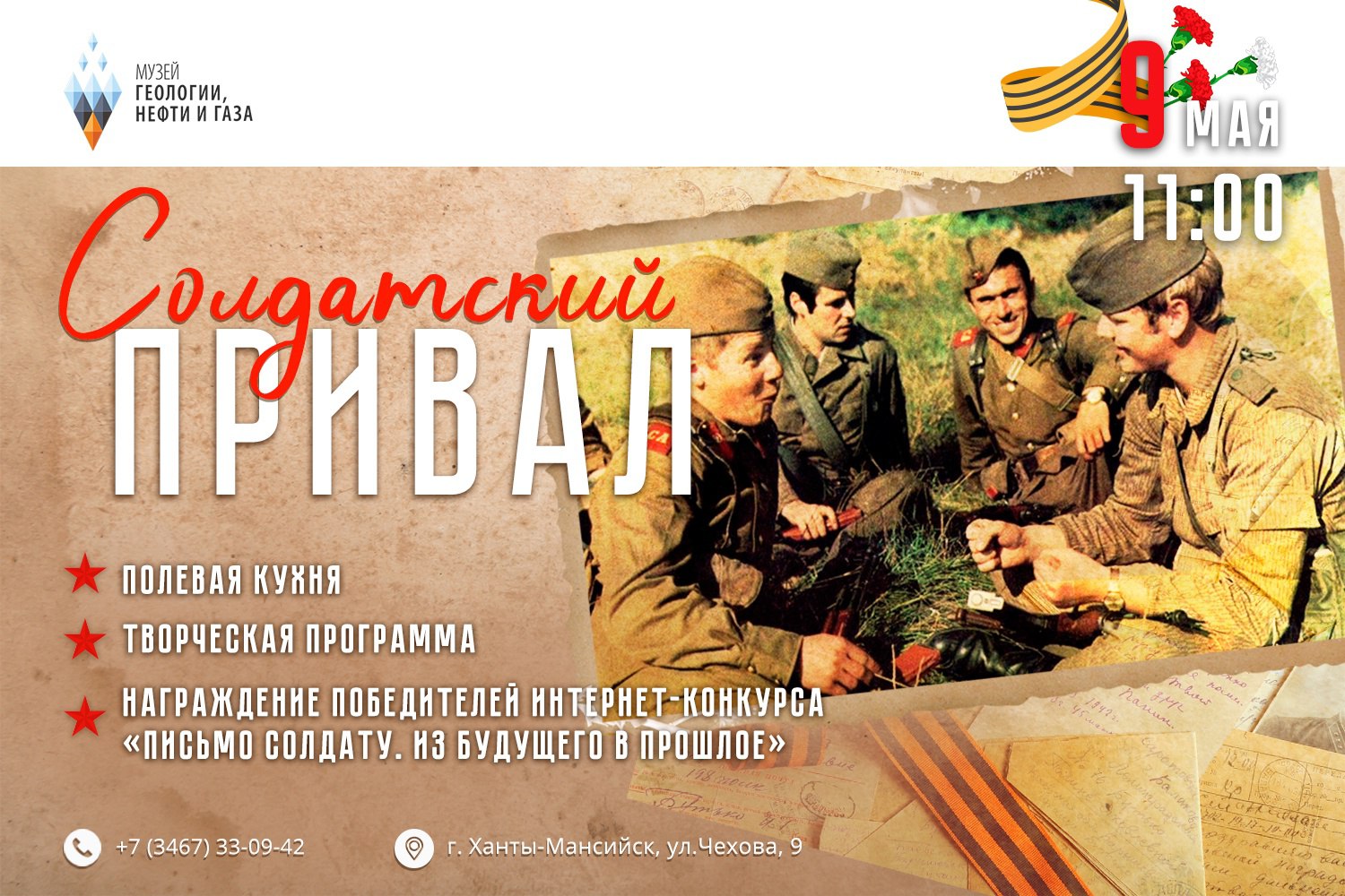 Музей геологии, нефти и газа 9 мая традиционно проводит на примузейной площади творческую программу «Солдатский привал», посвященную Дню Победы в Великой Отечественной войне 1941-1945 годов. Мероприятие стало доброй традицией окружной столицы и ежегодно собирает более 600 участников – жителей и гостей города, среди которых представители старшего поколения, семьи с детьми, молодежь.