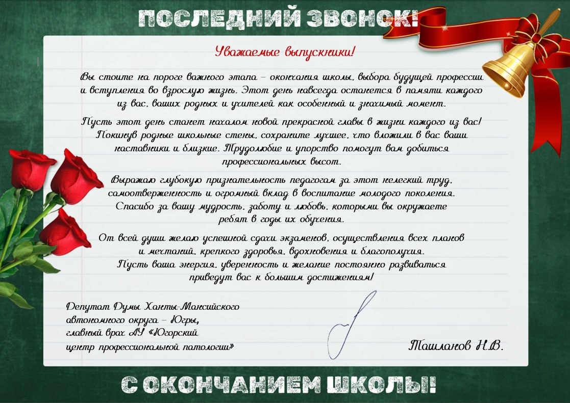 Главный врач Центра профессиональной патологии, депутат Думы Югры Николай Ташланов направил поздравления выпускникам и учителям школ Ханты-Мансийска и Ханты-Мансийского района.