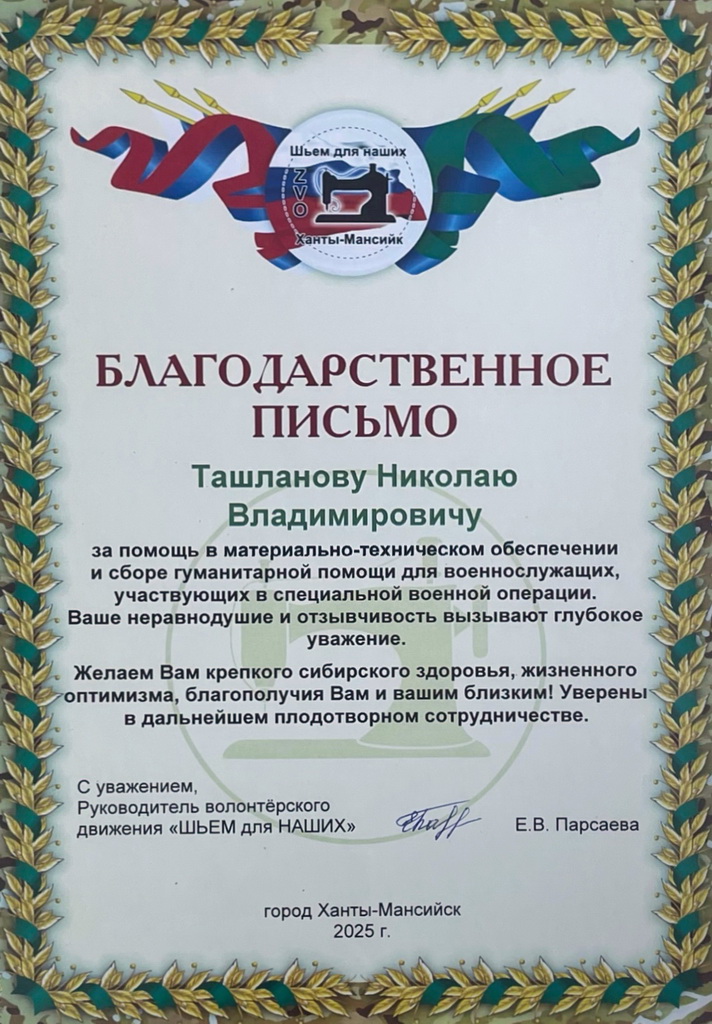Главный врач, депутат думы Югры Николай Ташланов получил Благодарственное письмо за многолетнюю поддержку общественного движения «Шьем для наших» в Ханты-Мансийске.