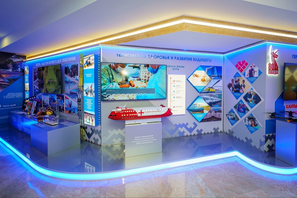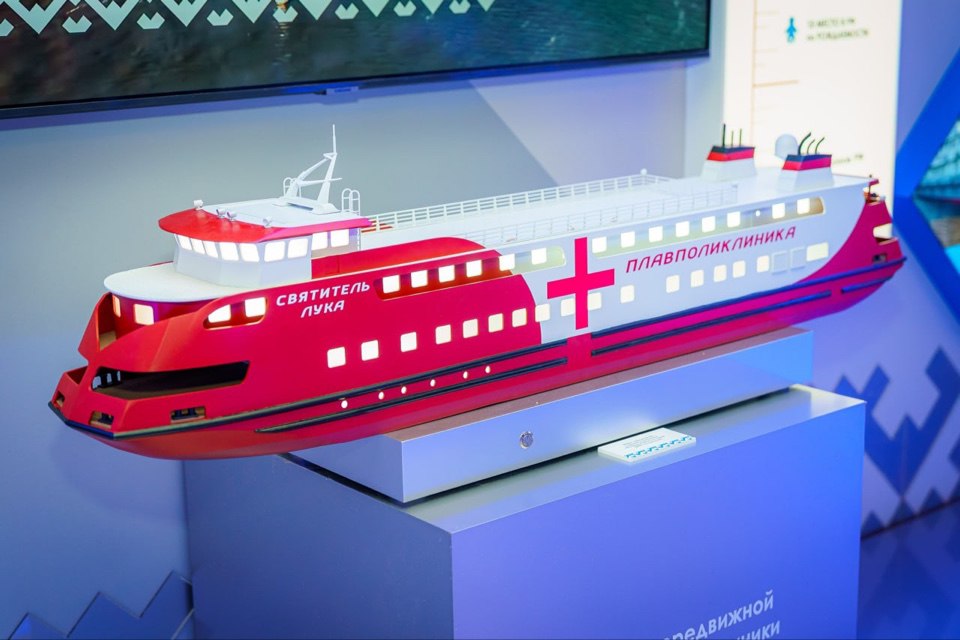 Особое внимание привлекла часть экспозиции, посвященная развитию здравоохранения. Одним из его центральных элементов стал реалистичный макет плавучей поликлиники «Святитель Лука» – нового теплохода медицинского назначения, который начнет свою работу в Югре уже в следующем году.